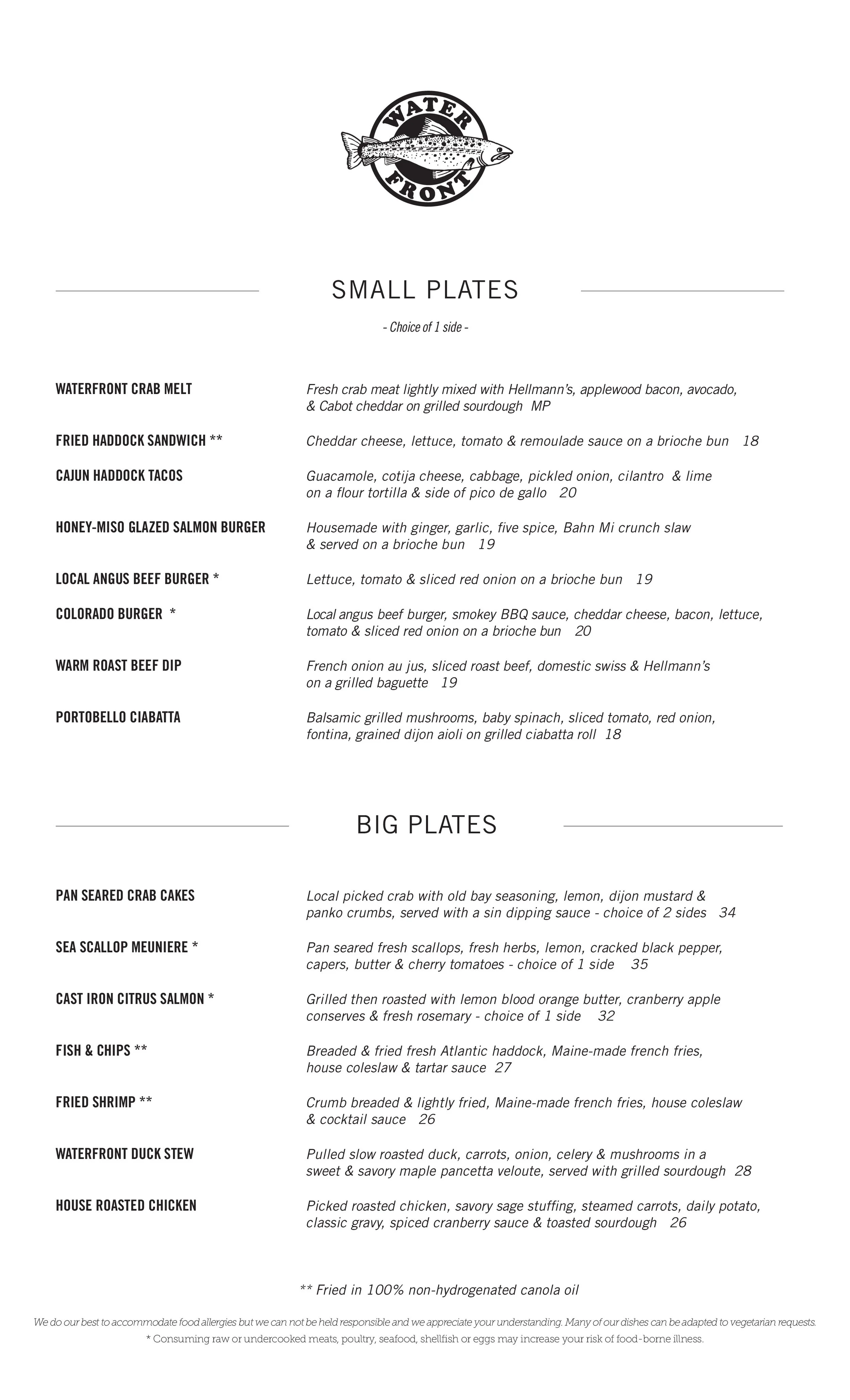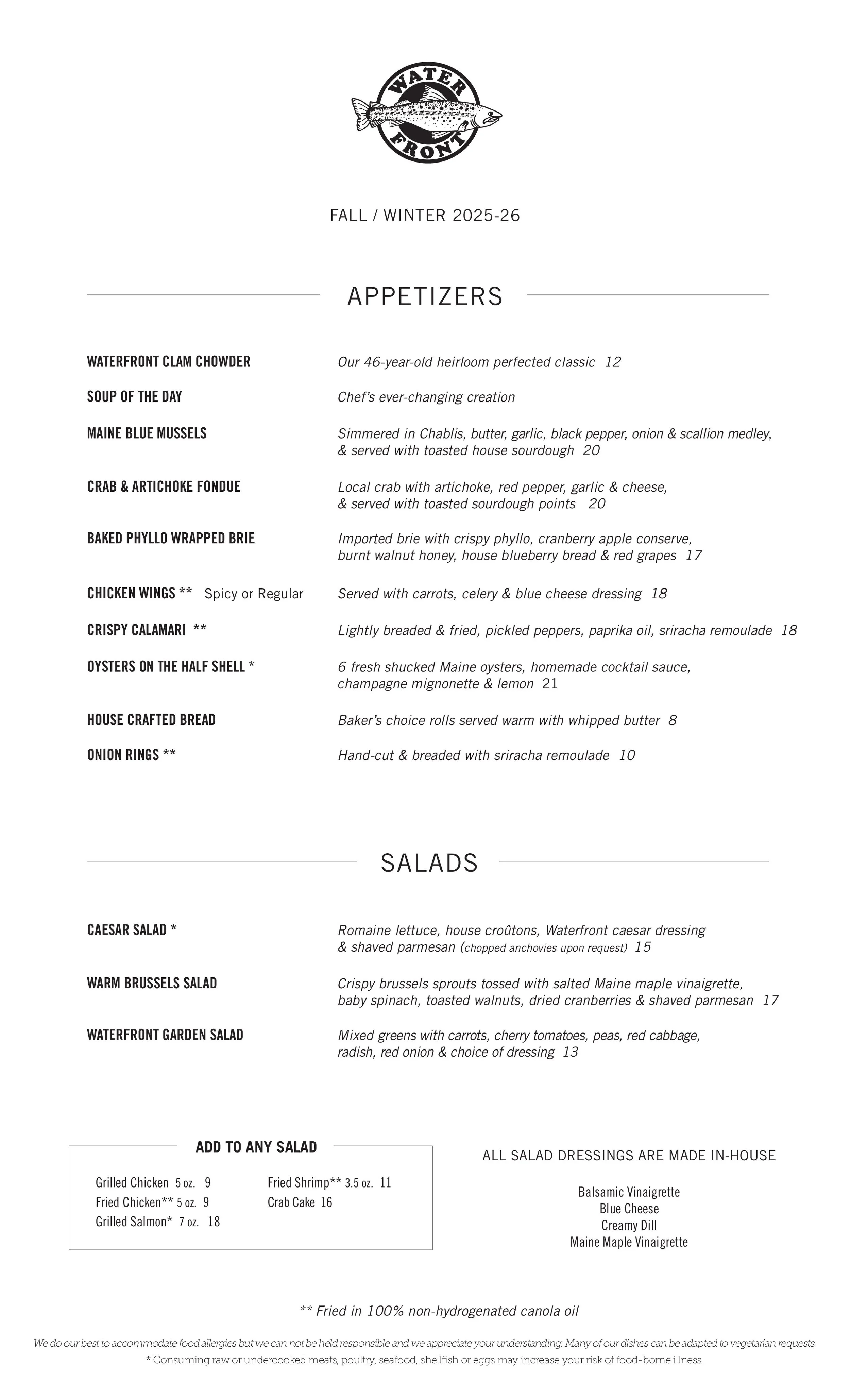 The Waterfront balances the basics with the innovative styles of cooking, bringing goodness to your table. We buy from area fishermen and farmers, hire local kids, and stay open year round as a place for the winter hardy to gather by the fireplace. Visit us and experience a restaurant that has been part of the mid coast for forty-five years!